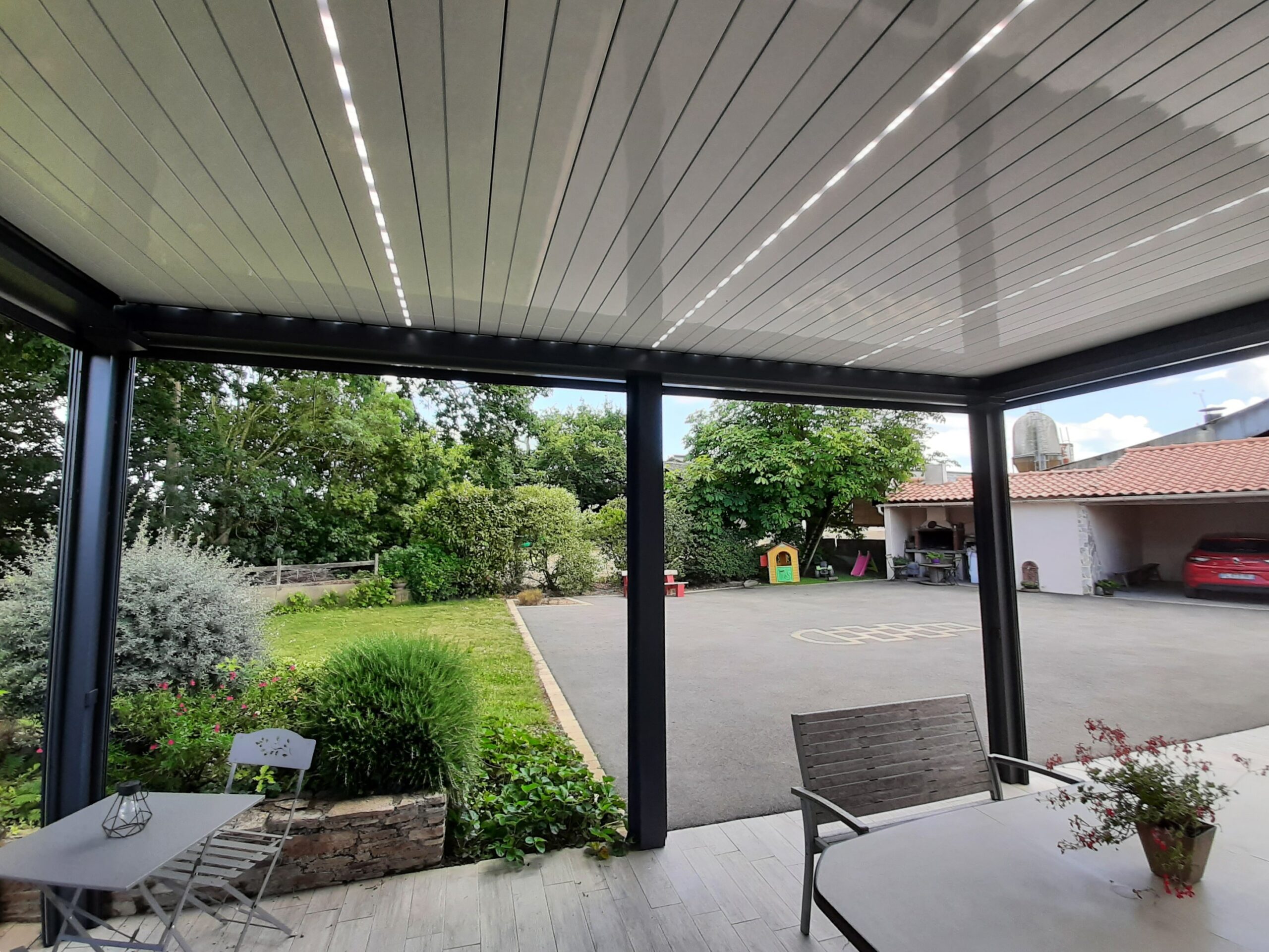 Ces dernières se répartissent en deux paquets distincts qui se séparent au centre du toit de la pergola lors de l’ouverture.